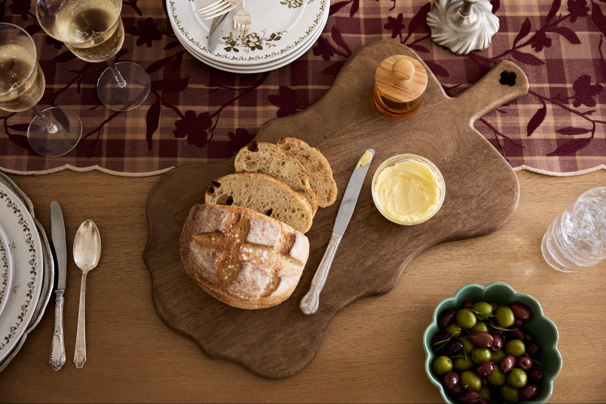 Dining table setting with decorative plates, cutlery, and a plaid napkin on a checkered tablecloth.