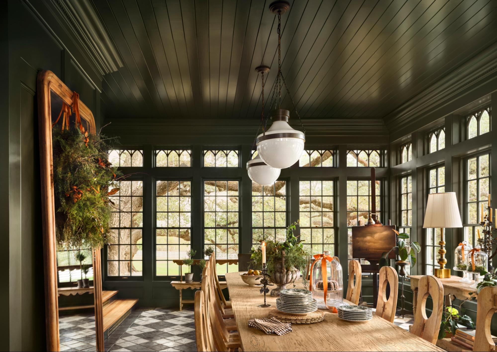 A white coffee table is filled with holiday decor—like a wooden tree, metal tray, festive candle, and more.