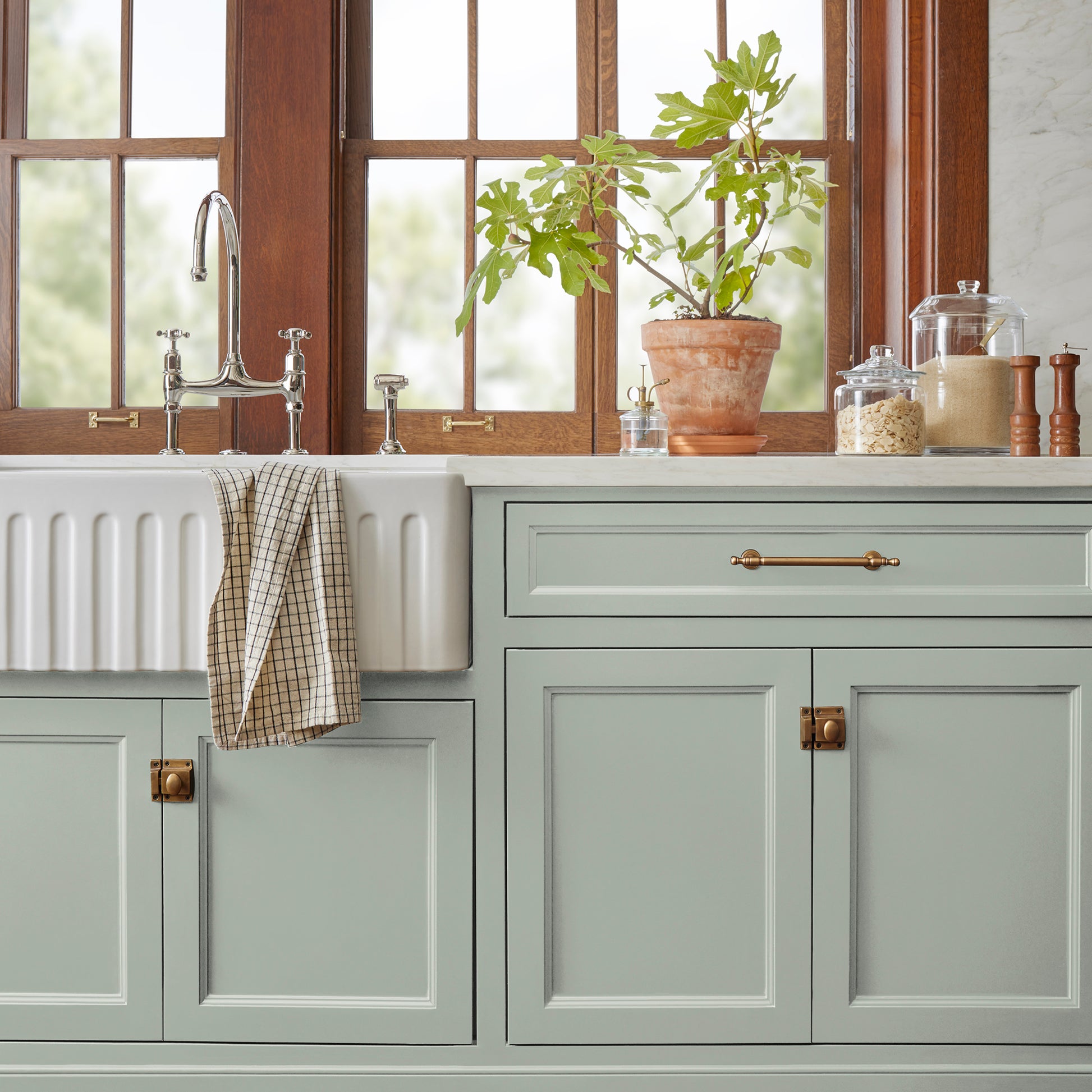 Cloudy gray with mint green and sky blue undertones trim, door and cabinetry paint.