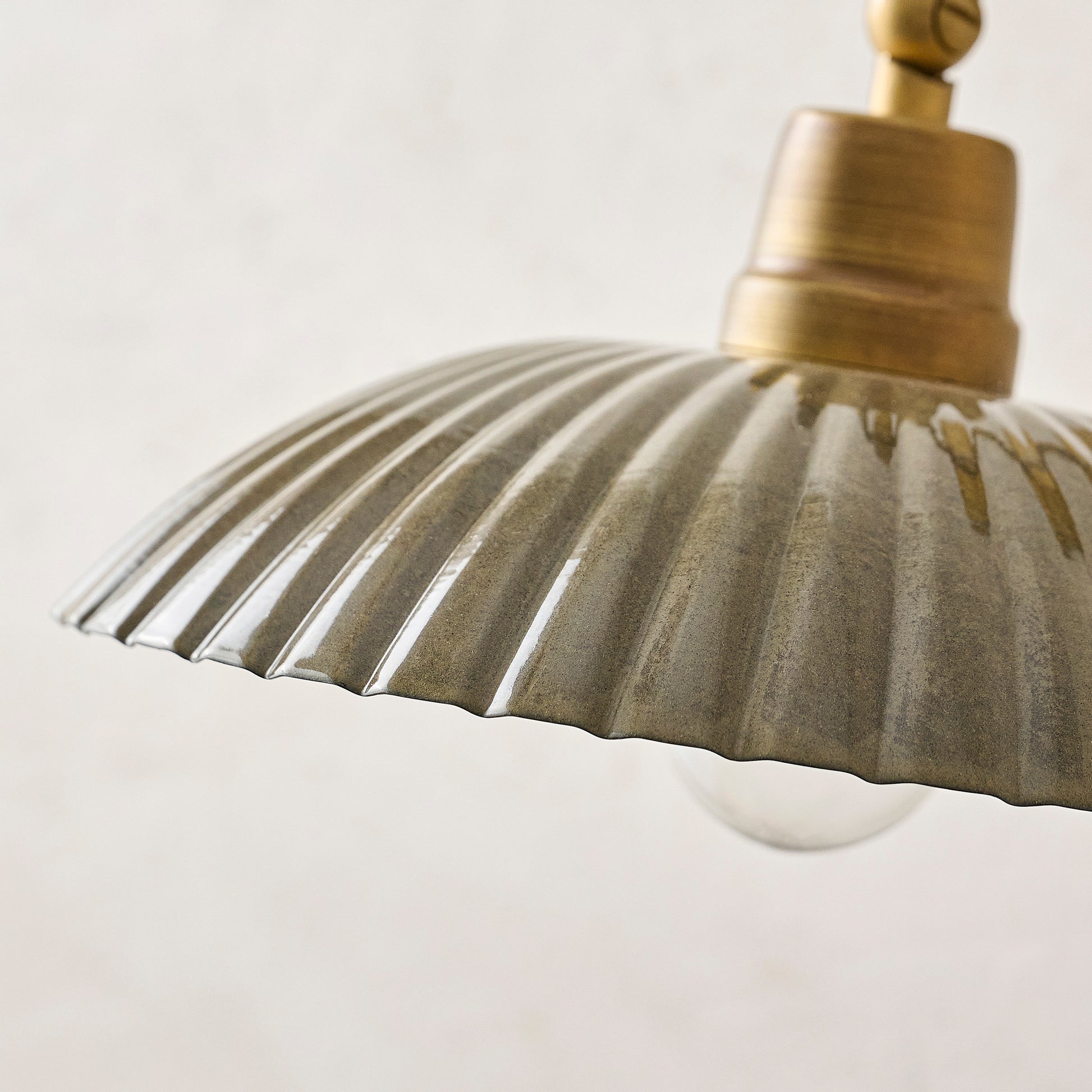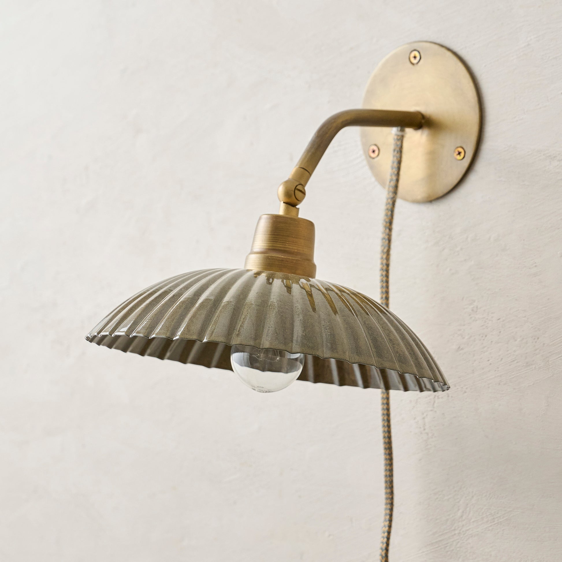 Our Chester Sconce comes in a beautiful antique-brass finish and muted green metal shade detailed with subtle pleating. Exclusive to Magnolia, this plug-in sconce looks lovely shedding light on a statement piece, illuminating a bedside table, or making a reading nook feel extra cozy. The power switch is located on the cord.