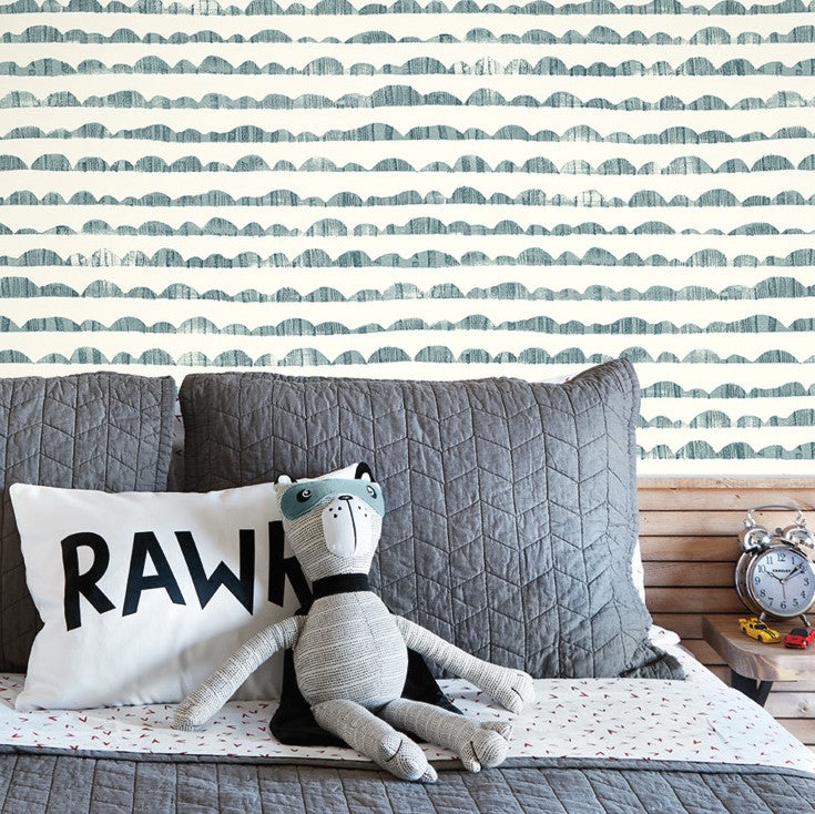 Rolling hills in silhouette create a scenic landscape of horizontal stripes with their shapes charmingly enhanced by an overlay of print, reminiscent of hand painted cloth.