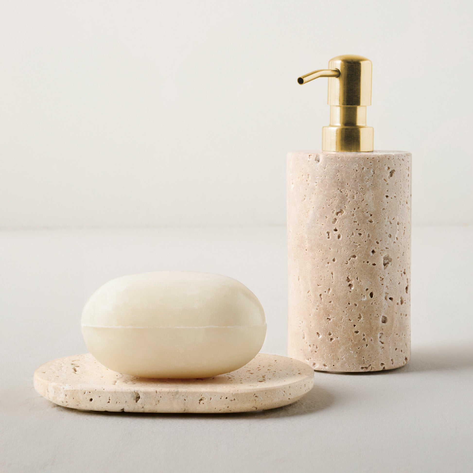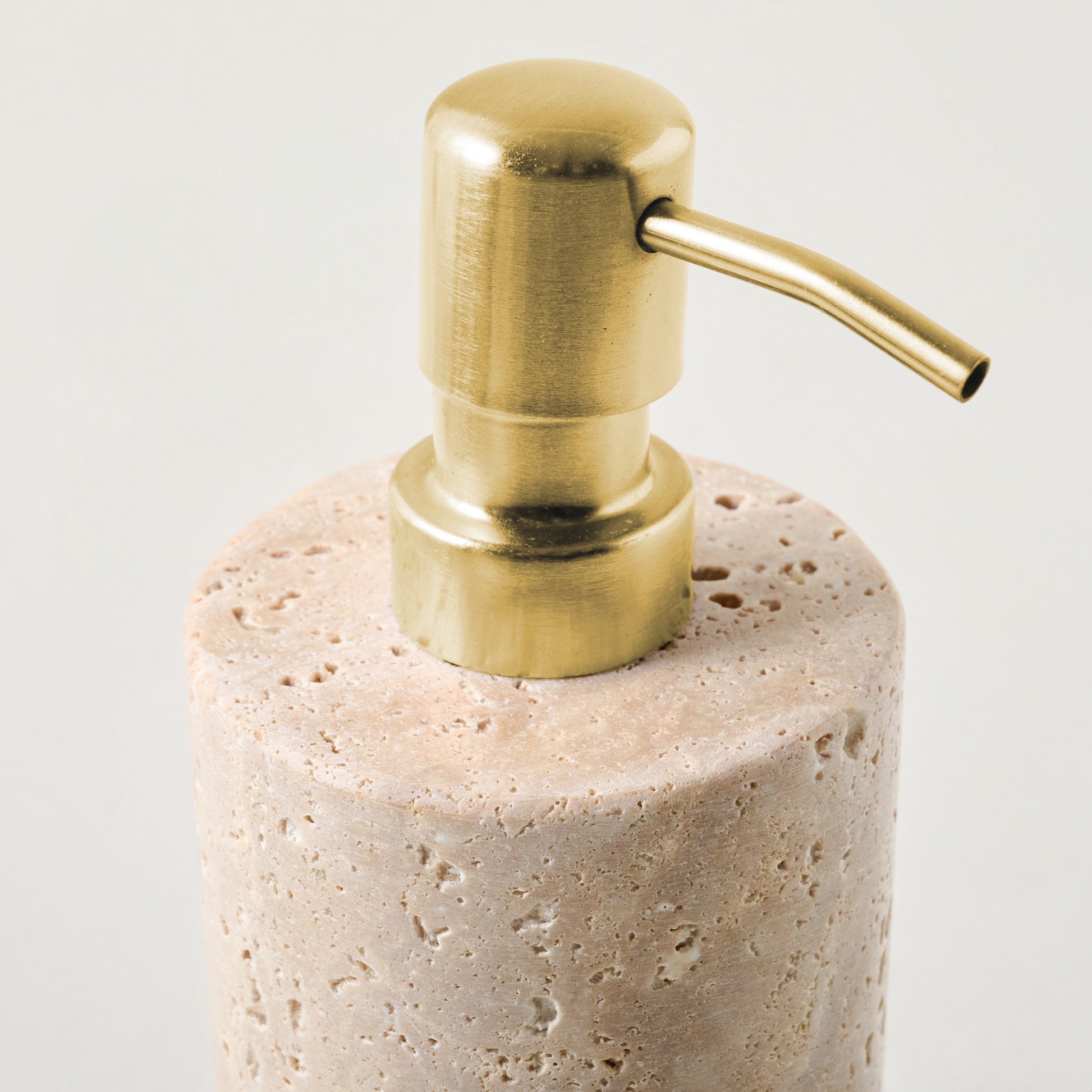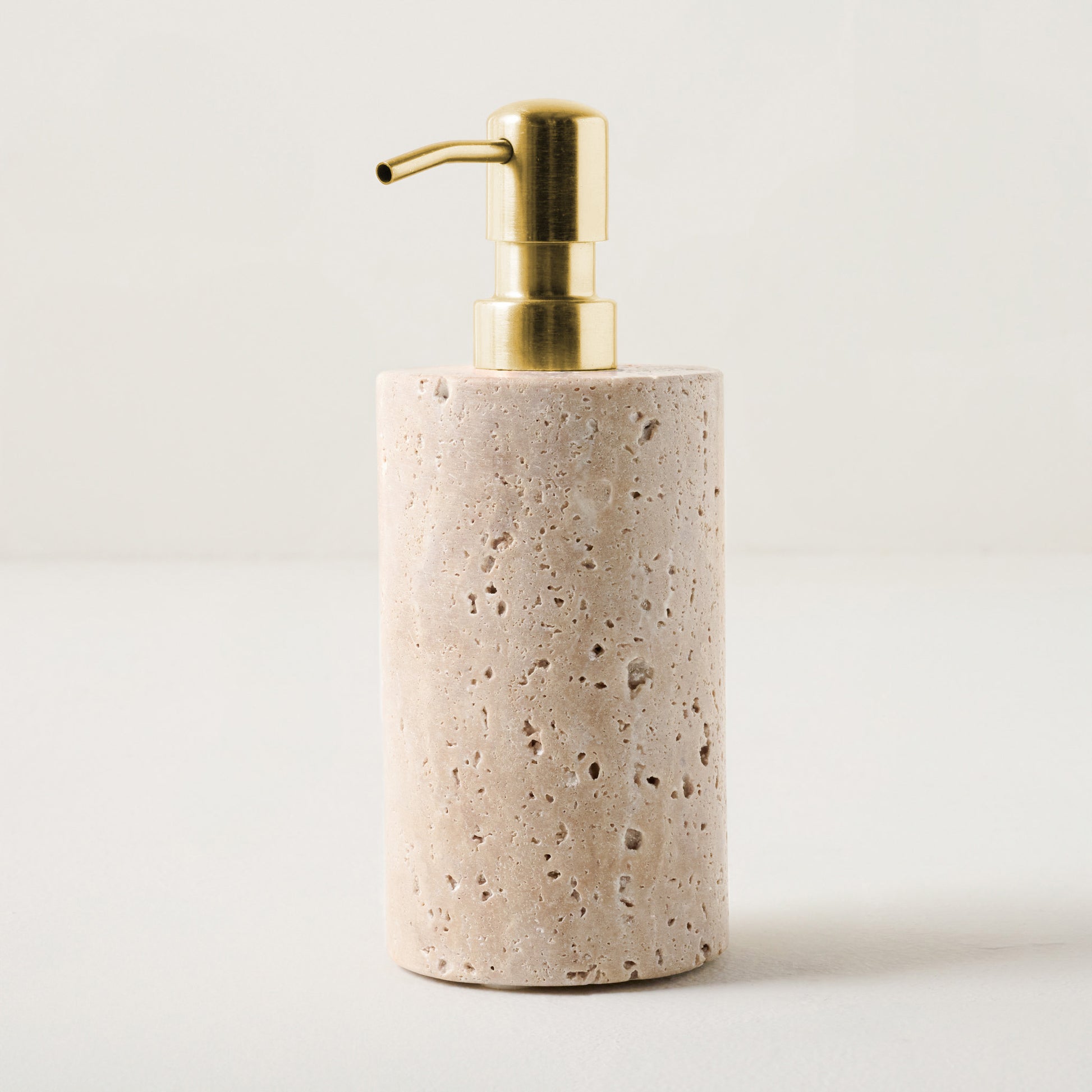 Crafted from travertine, this soap dispenser offers a timeless and classic way to store your liquid hand soap. Its earthy, textured finish and cylindrical silhouette bring opulence and elegance to your bathroom counter, transforming everyday essentials into something beautiful and special.